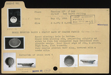 | Description: | Spout missing; hole in bottom. Small basin; heavy downsloping rim, projecting slightly at sides to form two elongated lugs decorated with plastic ovolo. Near inner edge of rim, a groove. High base, flat beneath. Very coarse pinkish-buff clay. Covered with a cream slip. Imitation of stone work? ADDENDA At first, spout was restored in plaster; later it was removed, as uncertain. | |
