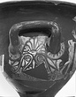 | Description: | Two non-joining fragments from a red figured krater. Black inside with reserved band. a) A head left, part of a head at the right, and a hand holding a torch? b) Three heads and parts of torsos. A bit of out-turned rim above with traces of leaf pattern. The surface heavily incrusted with iron corrosion. Relief contours extremely coarse, for the profiles, and much of the other drawing. White for leaves(?) rising from fillets, and for the flame of the torch. Many additional fragments found later and the whole made up in plaster. None of the lip or of the foot remains and the foot as restored is probably a trifle too high. A: Torch racers. Three youths to the left and two to the right of a goal post. Parts of the heads of all are preserved, and much of the bodies, also the torch of the figure at the extreme right. All are nude, and wear fillets from which project large white leaves. Extremely coarse relief contour for the heads and parts of the upper bodies. B: Three cloaked figures; parts of the lower wall only. | |