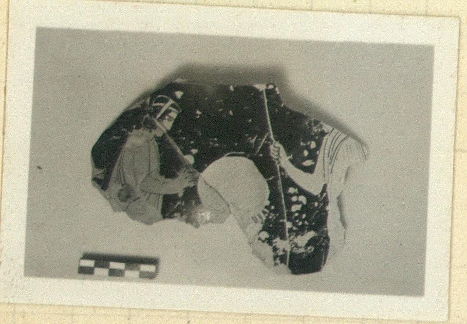 | Description: | From the shoulder of a large pelike (?). Unglazed inside, polished; surface much battered. At the left, a youth wearing an himation, moves right, playing flutes which are attached to a headband. In the center a small draped figure broken away, faces right; at right, a bearded figure, wearing an himation and holding a slender staff, faces left. At the extreme left of the fragment is a bit of a tray for offerings; held out by a fourth figure(?). AboIUU--*-----------------------+§ve, behind the flute-player's head, trace of some other object. Relief contour for profile and neck, and staff; spasmodically elsewhere. The glaze of hair and beard runs to brown. White (worn) for leaves on fillets and tray, and for a streamer depending from object at upper left. | |
