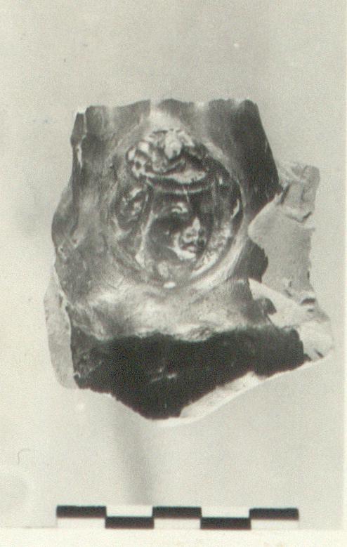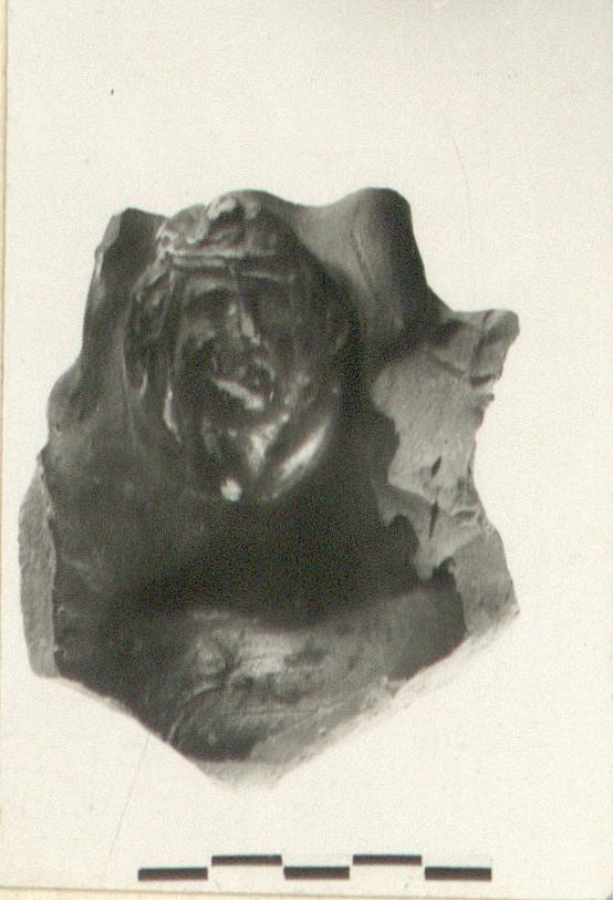 | Description: | Fragment of handle, probably from pitcher, with plastic head on inside of rim. The head, wreathed and filleted, is turned to its left. Pinkish clay. Red to black glaze. | |