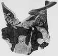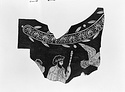 | Description: | Neck and shoulder fragment from an oinochoe type III; non-joining fragment from lower edge of panel. Around the neck, a band of encircled palmettes; springing from both sides of this band, long narrow leaves alternating with large berries on thin stems. At left, the top of the head of a female figure, right. Below, a partly draped bearded male figure, right; in his left hand a lotus-topped staff or scepter. only the upper part of the figure preserved; the right arm missing. Drapery falls over the left shoulder; a laurel wreath around the head. To the right of the fragment, at the center of the figured decorations, a large bird flies right; part of one wing missing (an eagle?). On the non-joining fragment, above a maeander and checkerboard border, the forelegs of two horses, galloping right. Relief contours throughout, but very poorly preserved; clear only on parts of the palmette band; elsewhere the glaze has flaked away, leaving a pale outline, beneath. Added clay for the berries of the neck decoration, and for a berry on the wreath. The eagle's plumage is entirely rendered in fine lines of added clay, over which has been laid gold leaf. Of the gold leaf a portion remains on the bird's wing; elsewhere the relief shows the pinkish color of sizing. Glazed inside shiny black to the bottom of the neck; at the shoulder, unglazed, below, thin wash. The glaze outside is severely mottled in firing. | |