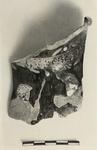 | Description: | Neck and shoulder fragment from an oinochoe type III; non-joining fragment from lower edge of panel. Around the neck, a band of encircled palmettes; springing from both sides of this band, long narrow leaves alternating with large berries on thin stems. At left, the top of the head of a female figure, right. Below, a partly draped bearded male figure, right; in his left hand a lotus-topped staff or scepter. only the upper part of the figure preserved; the right arm missing. Drapery falls over the left shoulder; a laurel wreath around the head. To the right of the fragment, at the center of the figured decorations, a large bird flies right; part of one wing missing (an eagle?). On the non-joining fragment, above a maeander and checkerboard border, the forelegs of two horses, galloping right. Relief contours throughout, but very poorly preserved; clear only on parts of the palmette band; elsewhere the glaze has flaked away, leaving a pale outline, beneath. Added clay for the berries of the neck decoration, and for a berry on the wreath. The eagle's plumage is entirely rendered in fine lines of added clay, over which has been laid gold leaf. Of the gold leaf a portion remains on the bird's wing; elsewhere the relief shows the pinkish color of sizing. Glazed inside shiny black to the bottom of the neck; at the shoulder, unglazed, below, thin wash. The glaze outside is severely mottled in firing. | |
