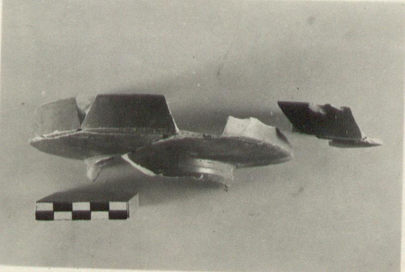 | Description: | Nearly half of floor preserved with part of rim and ring foot. One small fragment does not join. High ring foot, flat floor, vertical rim. Two wheel-run grooves around center of floor (not preserved). Pinkish-buff clay, firm red glaze over all. Western Sigillata. | |