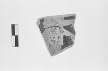 Description:   From a lekanis lid. Shiny black beneath. A woman standing three-quarters right. She wears a chiton with a long overfold, and girdle tied in front, finished with three raised dots at each end.