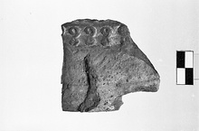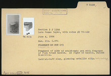 | Description: | Fragment of side of mould-made pot with fragment of flat broad handle. At right of handle, raised S-scrolls. Reddish-buff clay, gleaming metallic slip (mica-dusting). | |