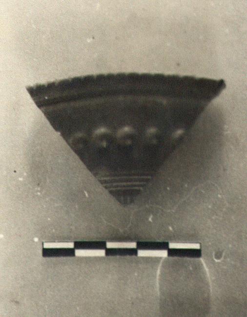 Fragment of rim preserved. Overhanging grooved horizontal rim; with a row of holes on the underside forming neat raised dots on the upper.
