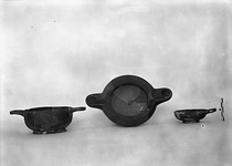 | Description: | Fragments missing from side. Crisp angular base ring; wall gently inturned; straight-sided handles. On underside, dot and ring pattern; floor plain. Glaze mottled black and red. | |