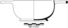 | Description: | Fragments missing from side. Crisp angular base ring; wall gently inturned; straight-sided handles. On underside, dot and ring pattern; floor plain. Glaze mottled black and red. | |