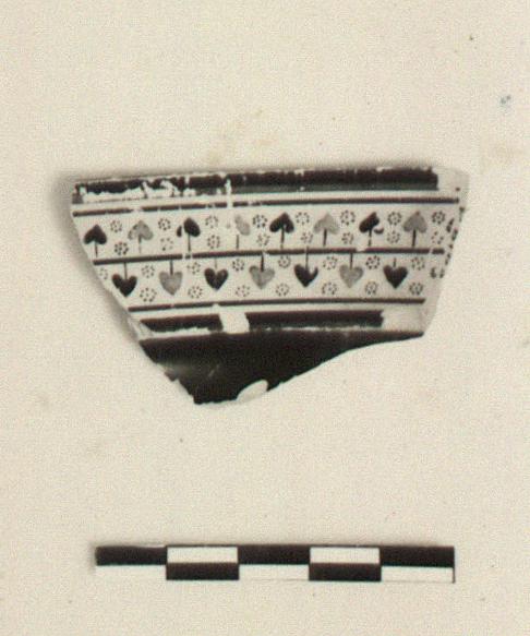 | Description: | Fragment of rim, sharply offset. On its upper surface, between two purple lines, a band of ivy pattern, the alternate leaves in purple. A purple line on underside at break of profile. Exquisite work. | |
