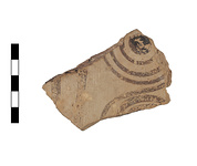 | Description: | From an open pot, krater(?), glazed inside. Beside the handle attachment, linked spirals running vertically; the centers filled with glaze. Poor dull black glaze. Submycenaean. | |