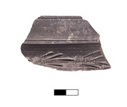 | Description: | From an open bowl or cup with vertical rim and sharply convex body. Grooves around top and bottom of rim. Gouged ornament, a wreath, on the shoulder. Gray clay, black glaze. | |