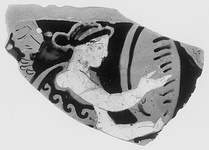 | Description: | Fragment from wall near top; broad reserved band near upper edge of fragment inside. Parts of two figures, right. At the left, a hand carrying a thyrsos; then a woman in an embroidered dress, carrying a large tympanum. White with yellow over-painting for the woman's flesh; added white for the berries of the thyrsos(?). No relief contours. | |