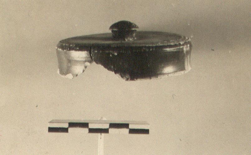 | Description: | Small round lid with downturned rim and small knob handle. Black glaze outside only. | |