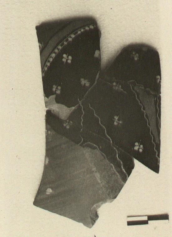 | Description: | From the wall of a large but thin-walled vase; made up of four fragments. The lower part of a garment, ornamented with white rosettes, a row of white dots, and purple bands. Incised lines indicate folds, and emphasize the ornament. Attic clay; interior rough and unglazed. Exterior, where the garment does not appear, shows a fine smooth surface covered with a thin slip or dilute glaze shading, in uneven stripes, from orange to reddish brown. | |