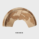| Description: | Large convex amphora lid, about one-third preserved and filled out in plaster. None of the handle. Shallow flange underneath near edge. Glaze bands on the top. Black to brownish glaze. | |