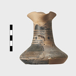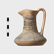 | Description: | Mouth, most of handle, and most of bottom missing. Restored in plaster. Concave bottom; squat body, lower and upper parts meeting at sharp angle; narrow upward-tapering neck. On body, bands; on neck, bands and linked dots; on handle, bars. Bluish glaze, somewhat peeled. | |