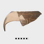 | Description: | Fragmentary deep pyxis or jar with flanged pierced inner rim. Part of the rim and one side only preserved; filled out in plaster. Several fragments do not join. Bands, separated by triple lines. From top: zigzag; triple zigzag; zigzag; hatched maeander; zigzag; triple zigzag; zigzag. Black to brownish glaze. | |