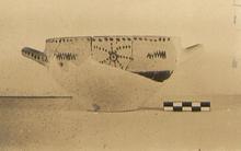 | Description: | Most of the upper body and one handle preserved; restored in plaster. Handle zone preserved to rim. At rim, ring of dots; beside handles, horizontal zigzags; at center, dotted circle, with dotted lines radiating from it. Dots on handle. | |