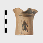 | Description: | Part of neck and trefoil mouth; filled out with plaster. Horizontal band above and below neck; rim glazed. On front of neck four-legged frog-like animal; vertical zigzags to sides. Pinkish-buff clay, slipped. Cf. Kerameikos, two unpublished pyxis covers with plastic frogs squatting on each side of horse handle. | |