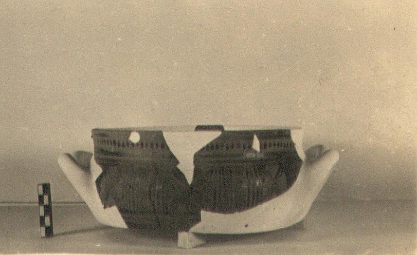 | Description: | Upper part filled out in plaster; none of bottom preserved. Similar to P 8244 (ΠΘ 1917), but smaller. On rim, dots between bands. In handle zone, panels with hatched vier-blatts, separated by vertical bands and columns of dotted lozenges, outlined. On lower body, wide and narrow bands. Bluish glaze, also inside; much peeled outside. Band of dots inside rim. ADDENDA P 8244: Rounded body and straight rim; vertical rolled double handles set below shoulder. | |