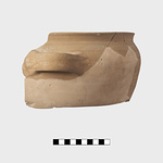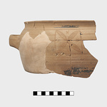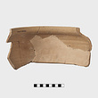 | Description: | Fragment from upper part only. Similar to P 8245 (ΠΘ 1918), but deeper, and with horizontal band handle. Rim and lower body and interior glazed. In central panel of handle zone, hatched vier-blatt. Three horizontal bands to each side. Slipped; bluish glze, mostly peeled. ADDENDA P 8245: Similar to P 8244 (ΠΘ 1917), but smaller. P 8244: Rounded body and straight rim; vertical rolled double handles set below shoulder. | |