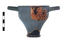 Description:   Three fragments, mended from several, give the base and part of the rim and wall; both handles are missing and there is no join between the wall and base fragments. Restored in plaster. Goblet-type skyphos. Beneath either handle a large palmette flanked by scrolls; on either side a cloaked figure, one holding a large oval object, right, the other left, largely indistinguishable. The resting surface reserved and the space inside the foot, with a large rough glaze circle near the center. Remains of heavy red wash.