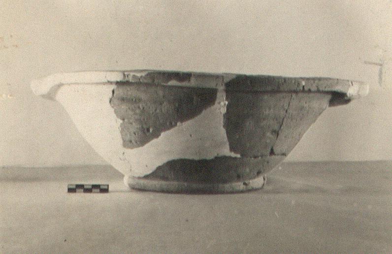 | Description: | Restored in plaster. Ring foot and flat projecting rim, grooved at the inner and outer edges of its upper face. Horizontal handles applied against rim to form lugs. Coarse heavy fabric; micaceous pink clay with white grits, unglazed. Non-Attic? Cf. Agora XXXIII, nos. 250, 280. | |