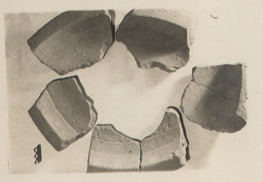| Description: | Five fragments from rim and floor of a coarse, very shallow basin; flat-bottomed(?); nothing of foot preserved. Floor slopes slightly towards thickened rim, set off from the floor by a groove. Rim flat on top; on the outside, three deep grooves. Heavy fabric; coarse buff clay. | |