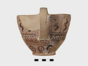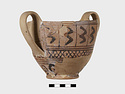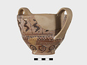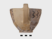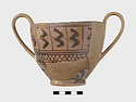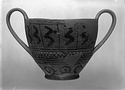 | Description: | Mended from many fragments; handles, most of one side and pieces from the other missing. Restored in plaster. Ring foot. Large reversed Σ pattern around upper part; below this, a diamond chain; around the base, curled up spirals; the decorative bands set off from each other by groups of narrow horizontal stripes; similar vertical stripes interrupt the pattern to form plain panels beneath the handles. Buff clay. Decoration, and inside, painted in dull brown glaze. For motifs, cf. Protocorinthian vases; Johansen (1923), Les vases sicyoniens, pl. XIX, 3. Early Orientalizing style. | |