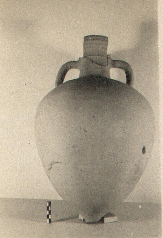 | Description: | Squat egg-shaped body and narrow neck with flaring mouth. The point at the bottom is broken off. Rolled handles. Micaceous pink clay, unglazed. | |