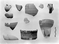 | Description: | Rim fragment. In handle zone, procession of birds to right; horizontal bands below. Brownish glaze. Protocorinthian. | |