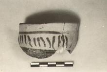 | Description: | Very slightly flaring rim. Lower body glazed; wavy line around rim. Careless verticals in handle zone. Reserved band inside rim. Streaky brownish glaze. | |
