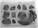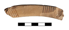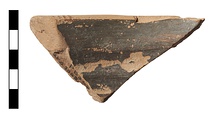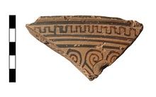 Description:   Plain rim, somewhat thickened and flat on top. Stroke series on top and glaze inside. Outside rim, plain line maeander between bands; vegetal ornament below.