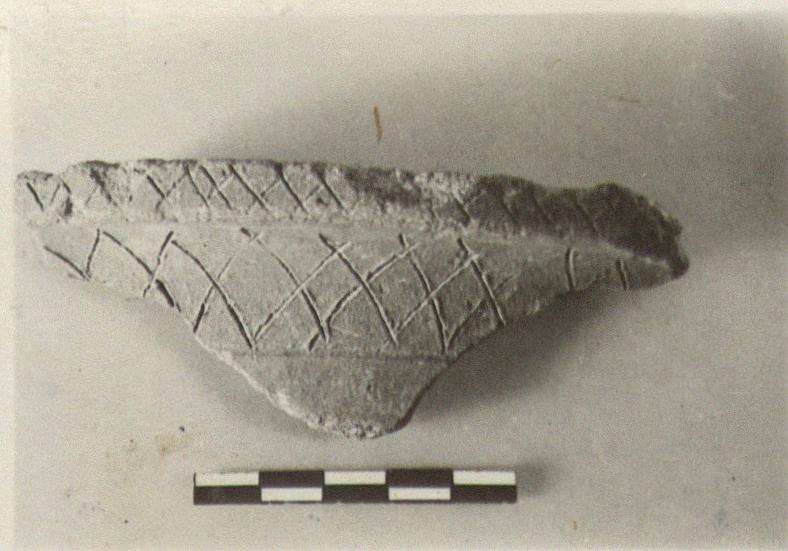 | Description: | Projecting rim flat on top and concave in section. Incised series of St. Andrew's crosses on outer edge of rim and below it outside. Micaceous red clay; handmade. | |