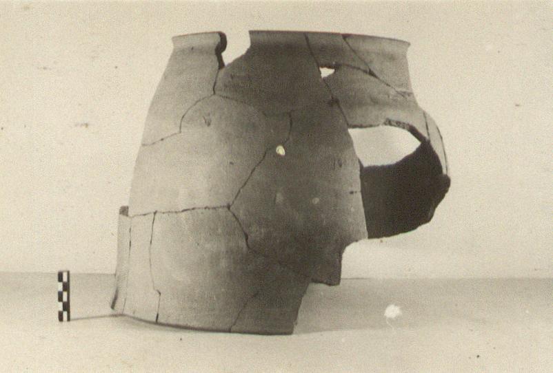 | Description: | High clay ring, slightly dome-shaped and open at top and bottom. Part of an opening with rounded top through the wall near the bottom, an air hole. Coarse micaceous pink clay, unglazed, and much burned inside. Cf. P 19102. | |