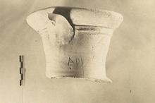 | Description: | Amphora neck. The mouth squeezed together and narrow from handle to handle. Flaring lip with two ridges beneath it. Painted in red: <graphic> Incised: <graphic> Buff clay. | |