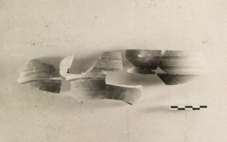 | Description: | Many fragments, mending into three non-joining fragments, preserving large parts of rim and side walls, none of base. Bowl with low sides and a high, nearly vertical rim, widely set off from walls. The rim is moulded, inside and out, with, outside, careful rouletting on the three raised bands. Fine pale pink clay, hard deep red glaze. Clay less hard and gritty, and lighter than the best Arretine, but this is surely Italian. Western Sigillata. | |