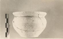 | Description: | Flat base; squat body, with medium-high shoulder marked by two horizontal grooves; low flaring rim, with plain lip, set off from body by a ridge. Clay deep buff at center, lighter at surfaces; yellowish-brown matte paint covers the inside, and the outside nearly down to the foot. | |