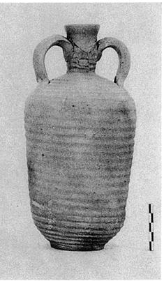 | Description: | Mouth above handles missing. Long body, with high shoulder, sides straight and tapering slightly to just above foot where they draw in sharply; low broad foot ring; narrow neck; small handles springing from well up on shoulder. Horizontal ridges on neck and body both. Fairly fine clay, slightly micaceous, pink to buff, unglazed. | |