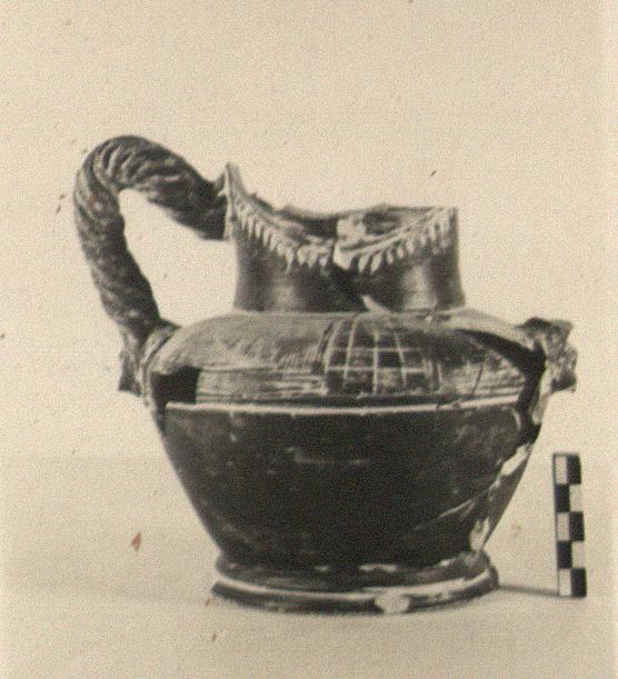 | Description: | Upper part of neck, one handle, and fragments from wall missing. Restored in plaster. Twisted handles with masks at the lower attachments. On the neck, jewelled festoon; leaf above; on the shoulder alternating diminishing squares and checkerboards. Scraped groove at base of neck, at base of shoulder decoration and around foot. Firm black glaze. Decoration in added clay color and white; red dots below the tips of the necklace. | |
