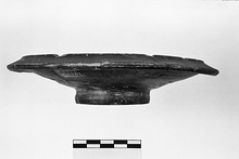 Description:   Half the ring foot and fragments from floor and rim missing. A slightly concave plate with a down-sloping rim which rises to a sharp ridge where it joins the floor.