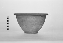 | Description: | Fragments from rim and wall missing. A deep bowl with flat grooved rim and ring foot. Red clay firing to pale buff and slipped. | |