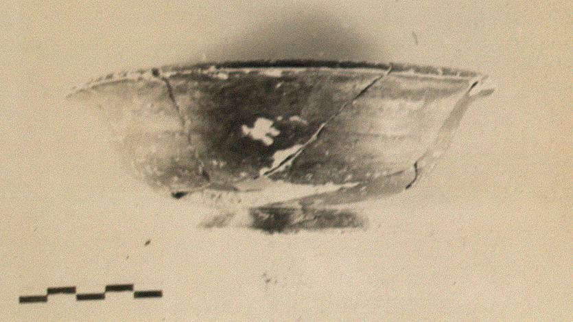 | Description: | About half missing. Restored in plaster. Ring foot; outcurved rim. Black glaze dull; somewhat chipped. | |
