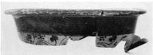 | Description: | [Originally identified as krater.] The rim and upper part of a krater; horizontal handles missing and all lower part. Black glaze around rim, reserved below with ivy pattern in black glaze. | |
