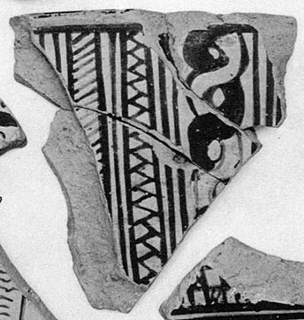 b) from the stand below, or possibly from another vase, preserves the remains of a checkerboard pattern on the upper part, which flares slightly above three horizontal stripes. Below, to the right, wavy horizontal lines; to the left, the front of a human head drawn in outline facing right.