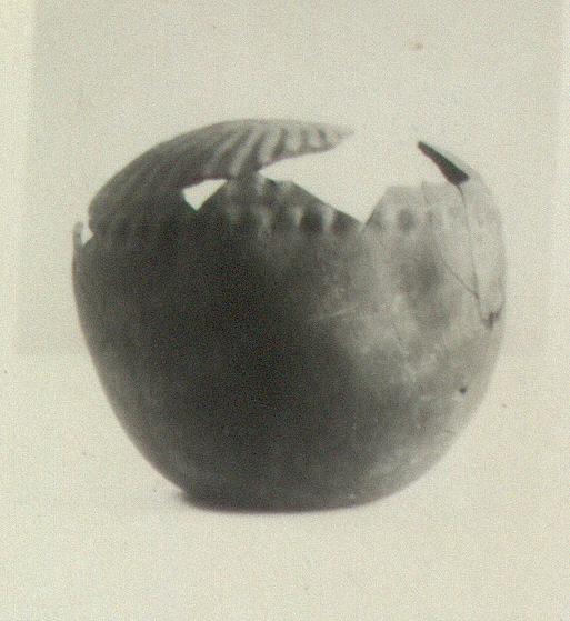 | Description: | Mended from many fragments; preserved to near top of shoulder. Coarsely made; dented. Bottom rising in center; deep body. Shoulder ornamented with radiating ribs and bosses repousssé, the latter surrounding the body where it turns to form the shoulder. Metallic effect. Coarse red clay. Rather thin fabric. Painted brownish-black; smeary paint. | |