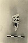 | Description: | Broken all around. Fragment from near shoulder of a large open vase. Thin black glaze on interior. Outside, above, black with very narrow reserved line, then letters in black glaze (V N), then part of an arm(?). | |