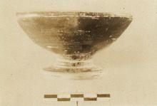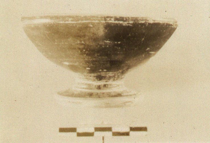 | Description: | Base and about one-fifth of body preserved. Short thick stem with two incised lines; shallow open bowl; plain rim with reserved line on top. Somewhat metallic black glaze; edge of foot reserved; center beneath, with circle and dot. | |