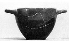 | Description: | One handle and much of rim missing; restored in plaster. Very low flat base instead of ring foot. Good glaze, black to mottled red, over all except on resting surface, inside of handles and between handle attachments. Fine reserved band just inside rim. Traces of stacking in kiln on outside. | |