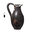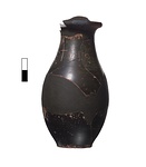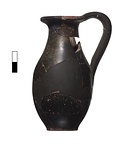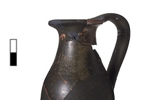 | Description: | Much of mouth and body and handle missing. Flat bottom. Elongated ovoid body, convex-concave contiguous with neck; flaring mouth. Handle, lip to point of greatest circumference. Restored in plaster. Pink clay; fine black glaze somewhat peeled. Incised just below neck: <graphic> Cf. ClRh III, p. 111. | |
